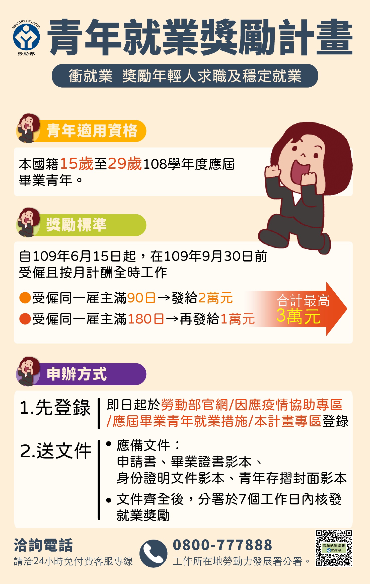 為利青年朋友瞭解本計畫,請惠予透過學校官網、電子郵件、Facebook及Line等可觸及學生之相關方式,向學生宣導。檢附本計畫說明EDM及各式尺寸Banner供參考運用(如附件);或可連接勞動部建置之專頁(網址:https://www.taiwanjobs.gov.tw/internet/2020/y oungTwn/),供青年查詢本計畫申請流程、申請表單、諮詢窗口及相關問答等資訊。