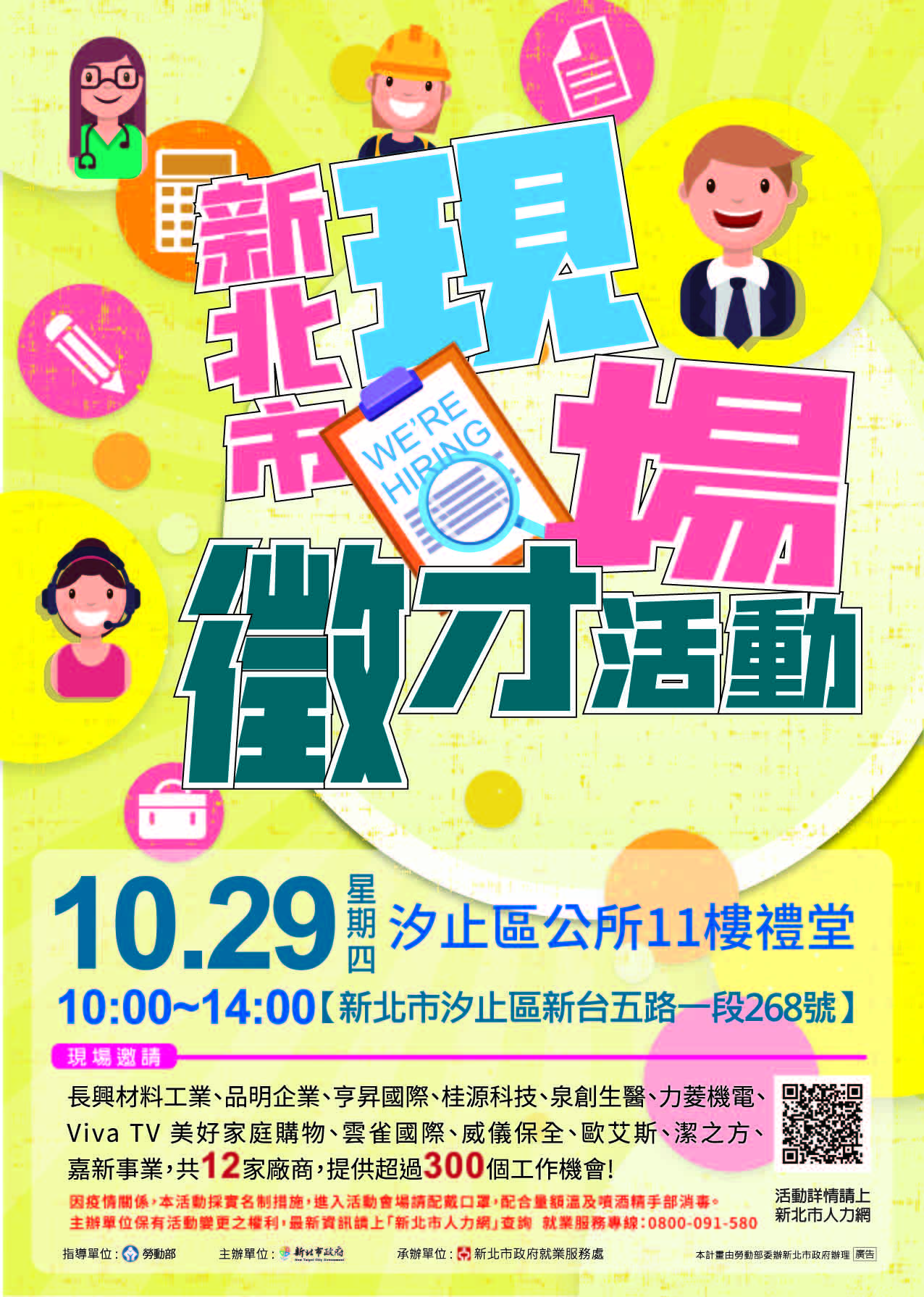 (一) 北市政府就業服務處於10月29日(四)早上10點至下午2點在汐止區公所11樓禮堂,舉辦「2020新北市現場徵才活動」,現場邀請12家知名廠商,提供3百多個工作職缺,歡迎求職者踴躍參加。。