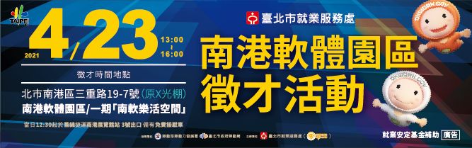 本處訂於110年4月23日「OKWORK南軟」南港軟體園區現場徵才活動,請於電子佈告欄及網站協助宣傳。