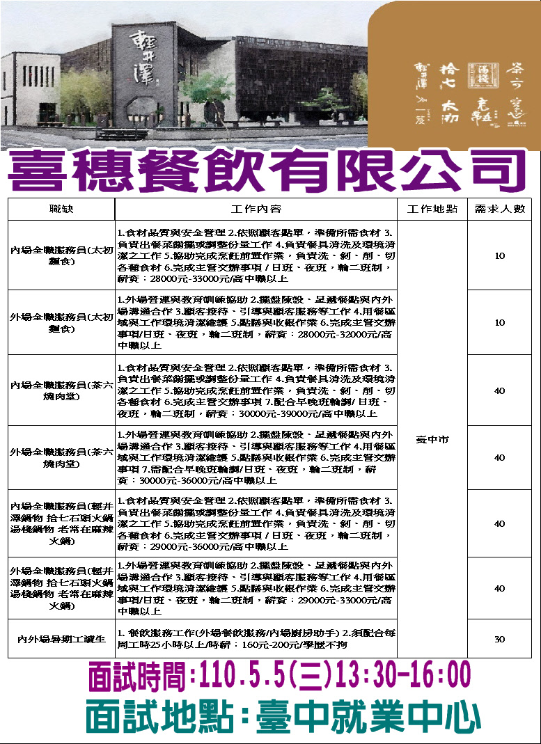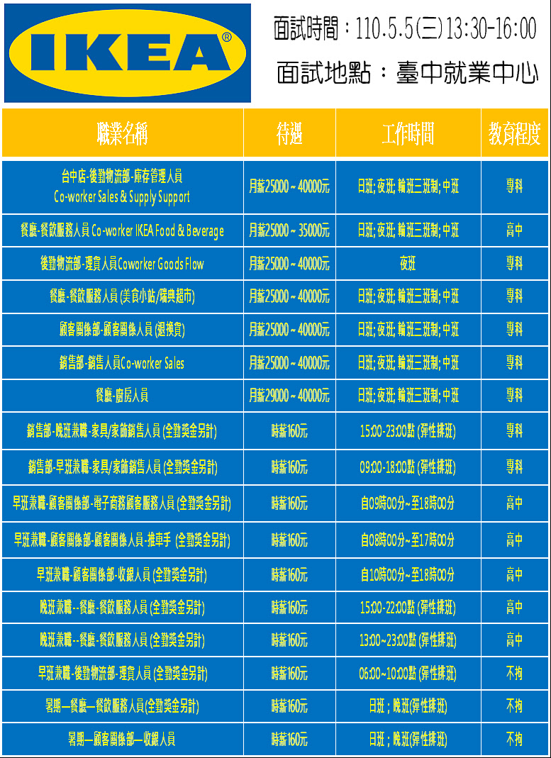 標題:【轉知】臺中就業中心5/5小型聯合徵才活動