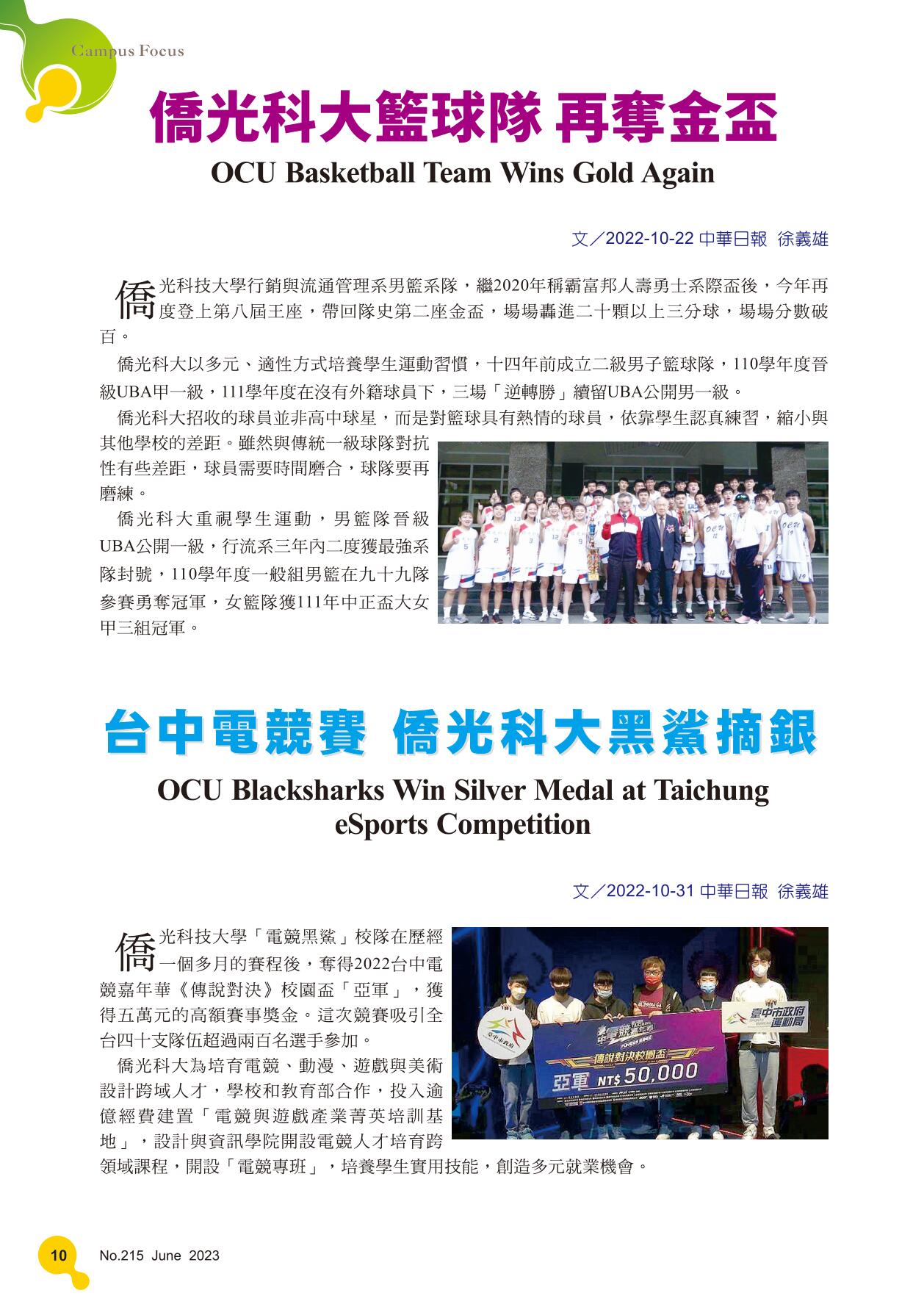僑光科大籃球隊 再奪金盃/台中電競賽 僑光科大黑鯊摘銀
