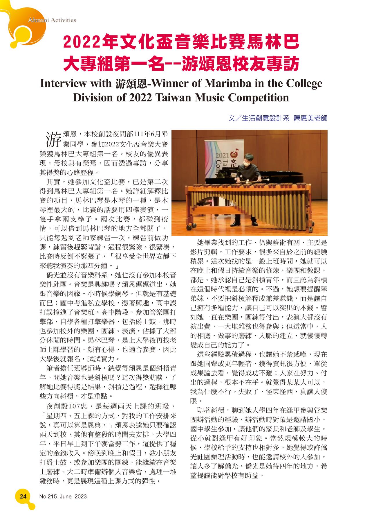 2022年文化盃音樂比賽馬林巴大專組第一名--游頌恩校友專訪